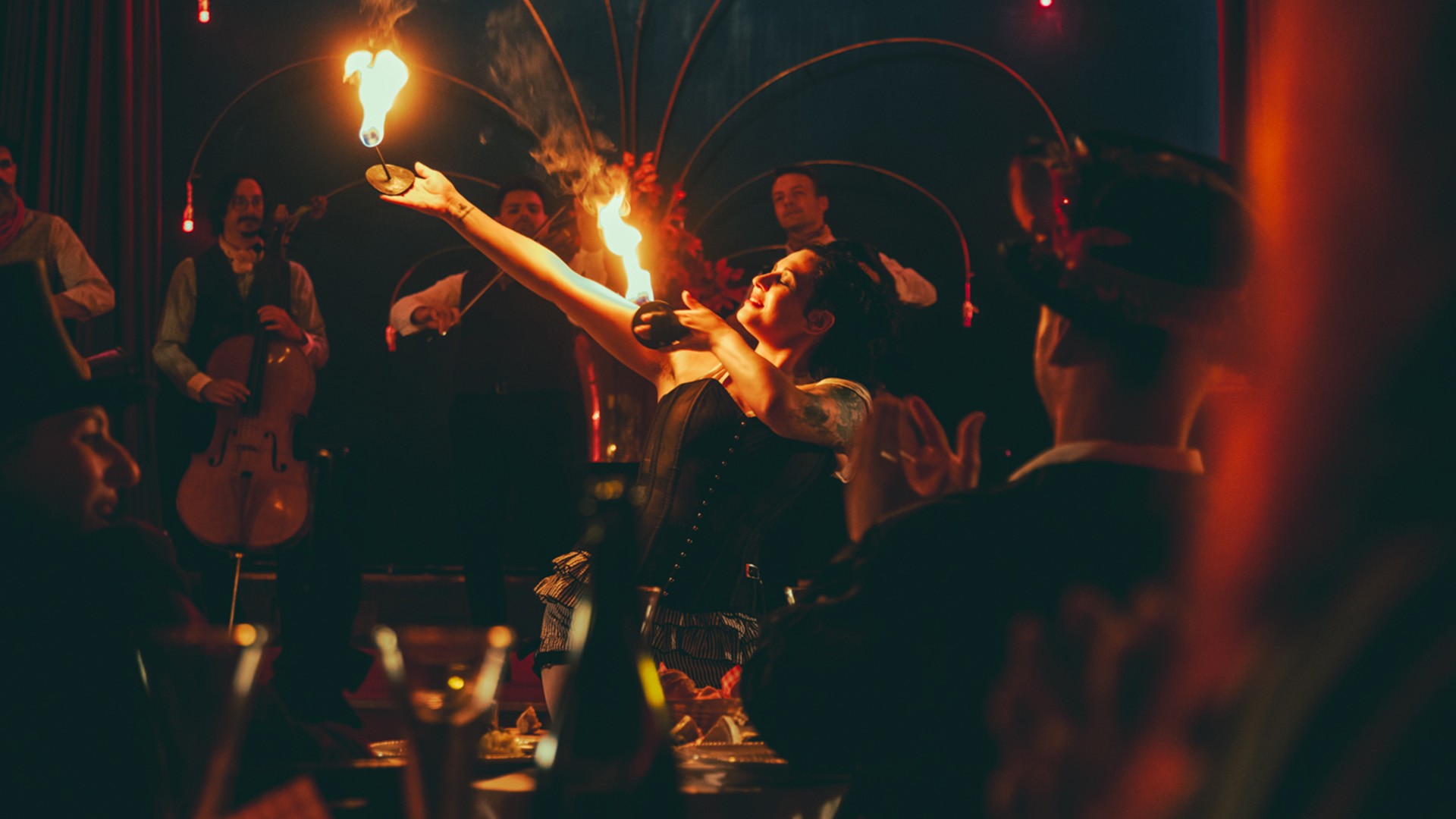 CHAT NOIR! weaves theatrical spectacle, indulgent haute cuisine, show-stopping theatrics, sultry chanson, and exotic cabaret routines into an unforgettable night. Les Enfants Vagabonds, a wild troupe of virtuoso musicians, roam between tables, conjuring the spirits of bohemian Montmartre with stunning musical performances from across the centuries.